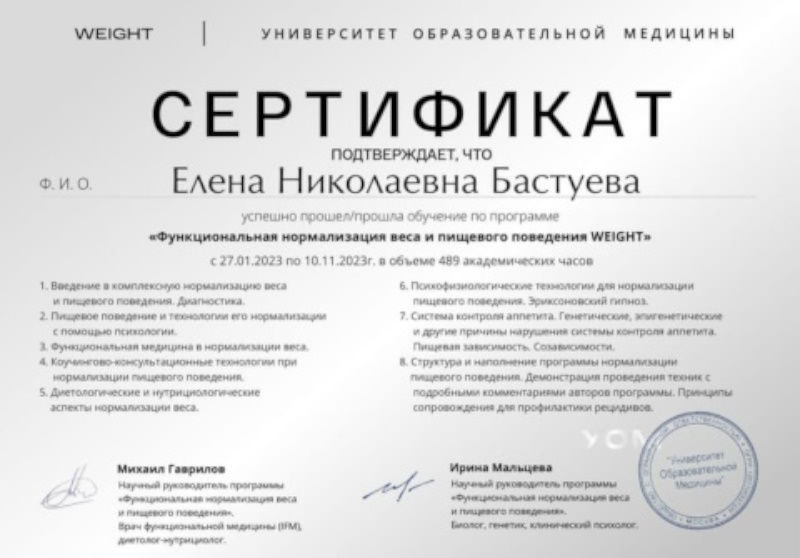 Елена Николаевна Бастуева - руководитель Центра снижения веса «Фигура и Комплименты», специалист по функциональной нормализации веса и пищевого поведения с более чем 20-летним опытом, работает на стыке нутрициологии, психологии, биохимии и осознанных привычек, помогая не просто снижать вес, а восстанавливать здоровье, возвращать энергию и формировать устойчивые изменения в теле и жизни.